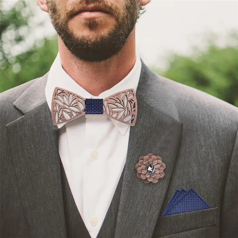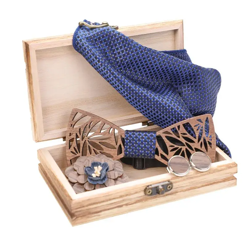 The set includes a wooden bow tie and matching wooden cufflinks, meticulously crafted to complement formal events, weddings, or a sophisticated business outfit. The natural wood grain pattern ensures that each piece is unique.